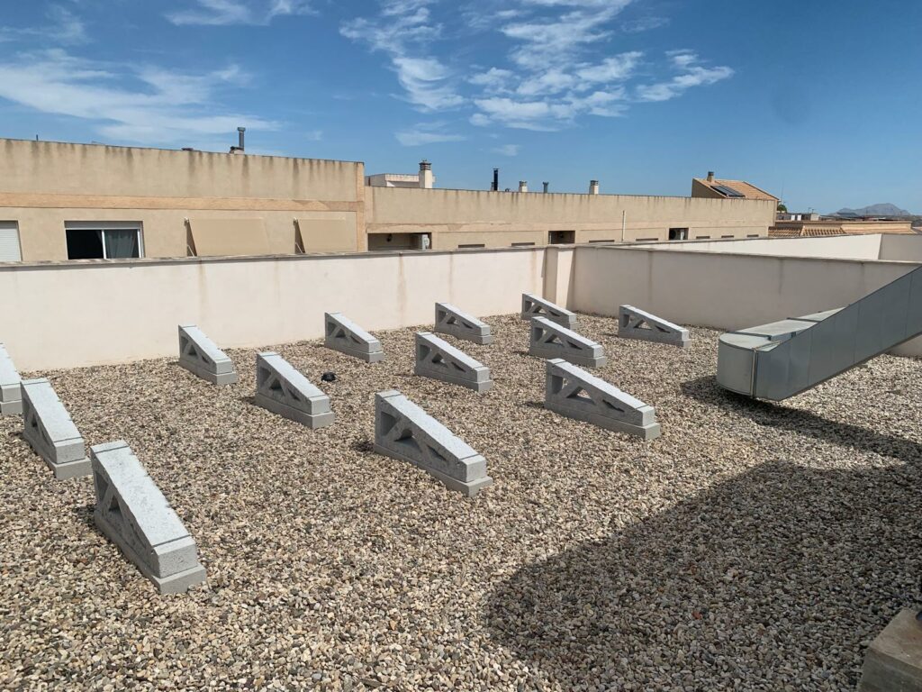 Este tipo de instalaciones con soportes de hormigón para paneles solares en cubierta plana es cada vez más habitual en proyectos fotovoltaicos en Málaga y otras zonas del sur de España, donde se priorizan soluciones duraderas, seguras y compatibles con cubiertas existentes.