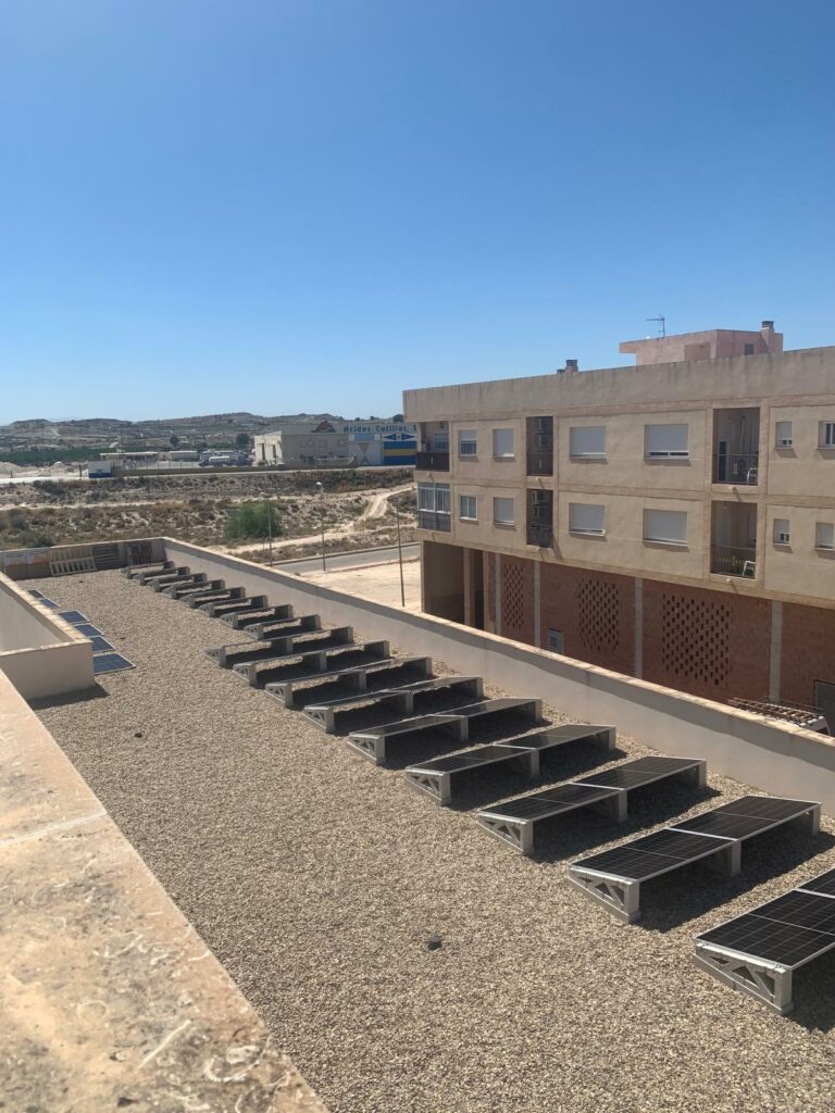 En esta instalación se han utilizado soportes de hormigón de 15 grados para paneles solares en una cubierta plana ubicada en Málaga, una solución habitual en edificios residenciales e industriales que requieren sistemas estables, duraderos y sin perforación de la impermeabilización.