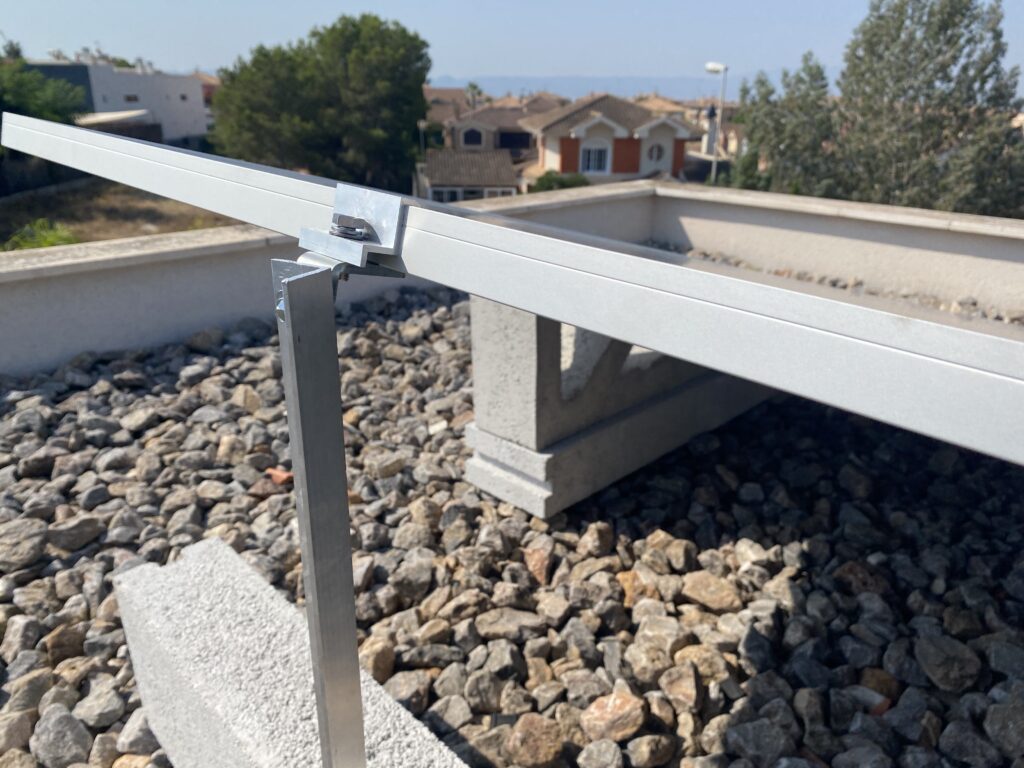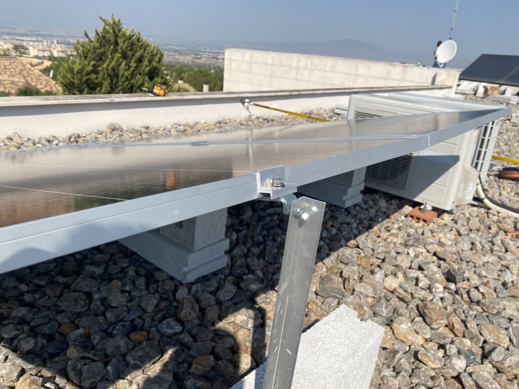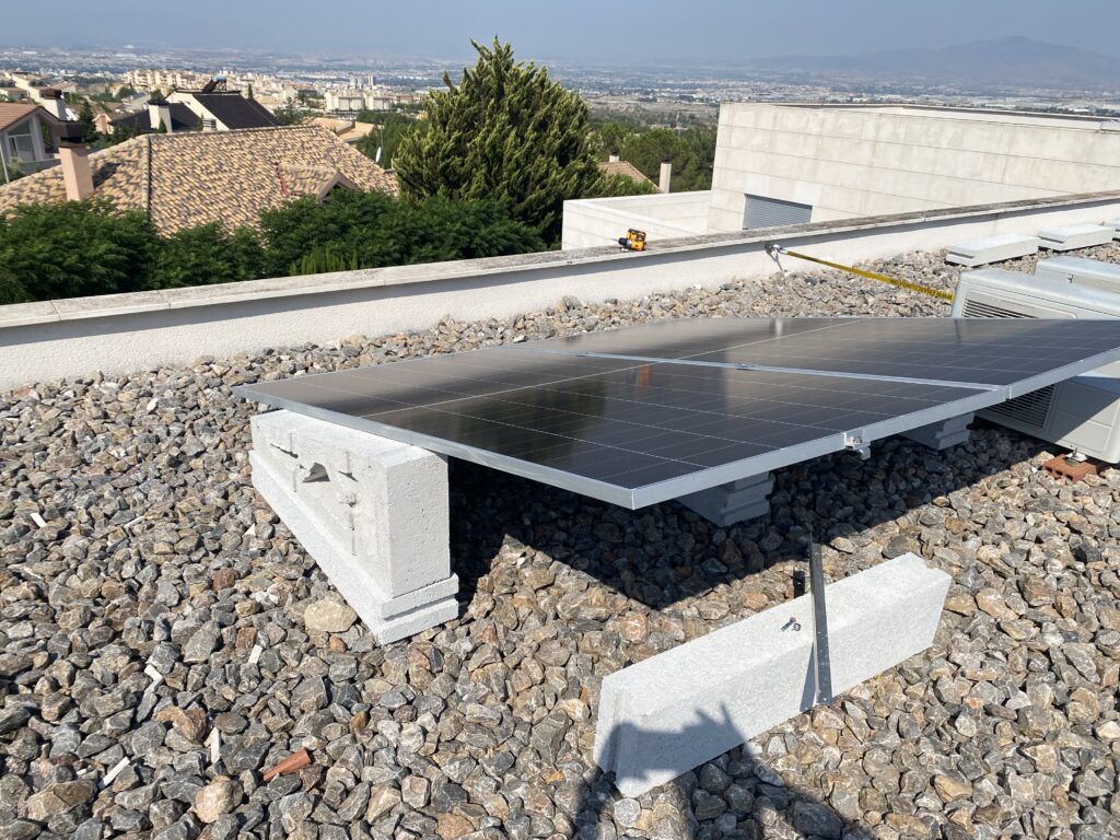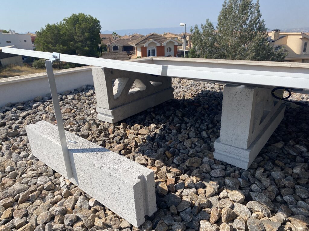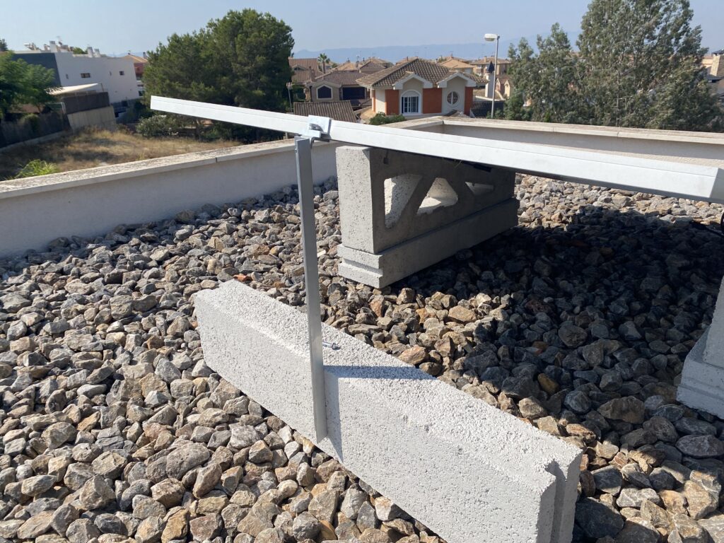 En esta ocasión compartimos una nueva instalación realizada en Finestrat (Alicante), donde se ha utilizado nuestro soporte de hormigón 15º en configuración horizontal, combinado con lastres de 50 cm, una solución especialmente indicada para cubiertas planas con acabado en grava.