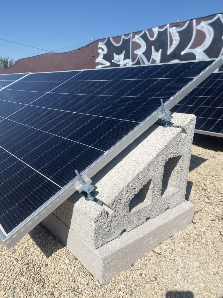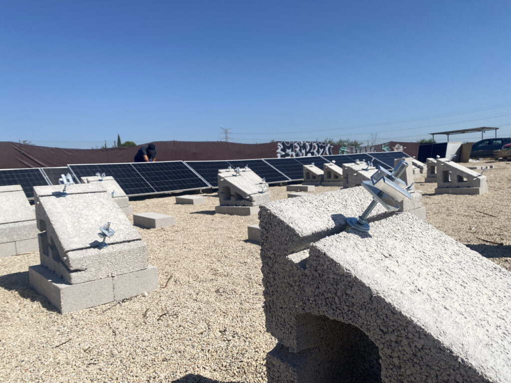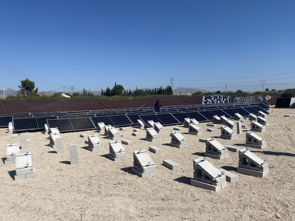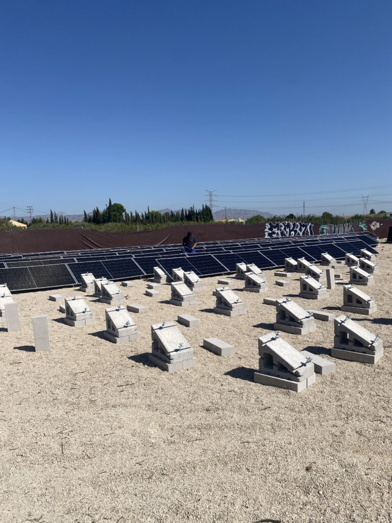 En esta instalación realizada en Alicante se ha optado por una solución con soportes de hormigón a 30º en disposición horizontal, combinados con lastres de 50 cm y sistema de nivelación, ideal para superficies donde es necesario corregir irregularidades del terreno sin realizar obra civil.