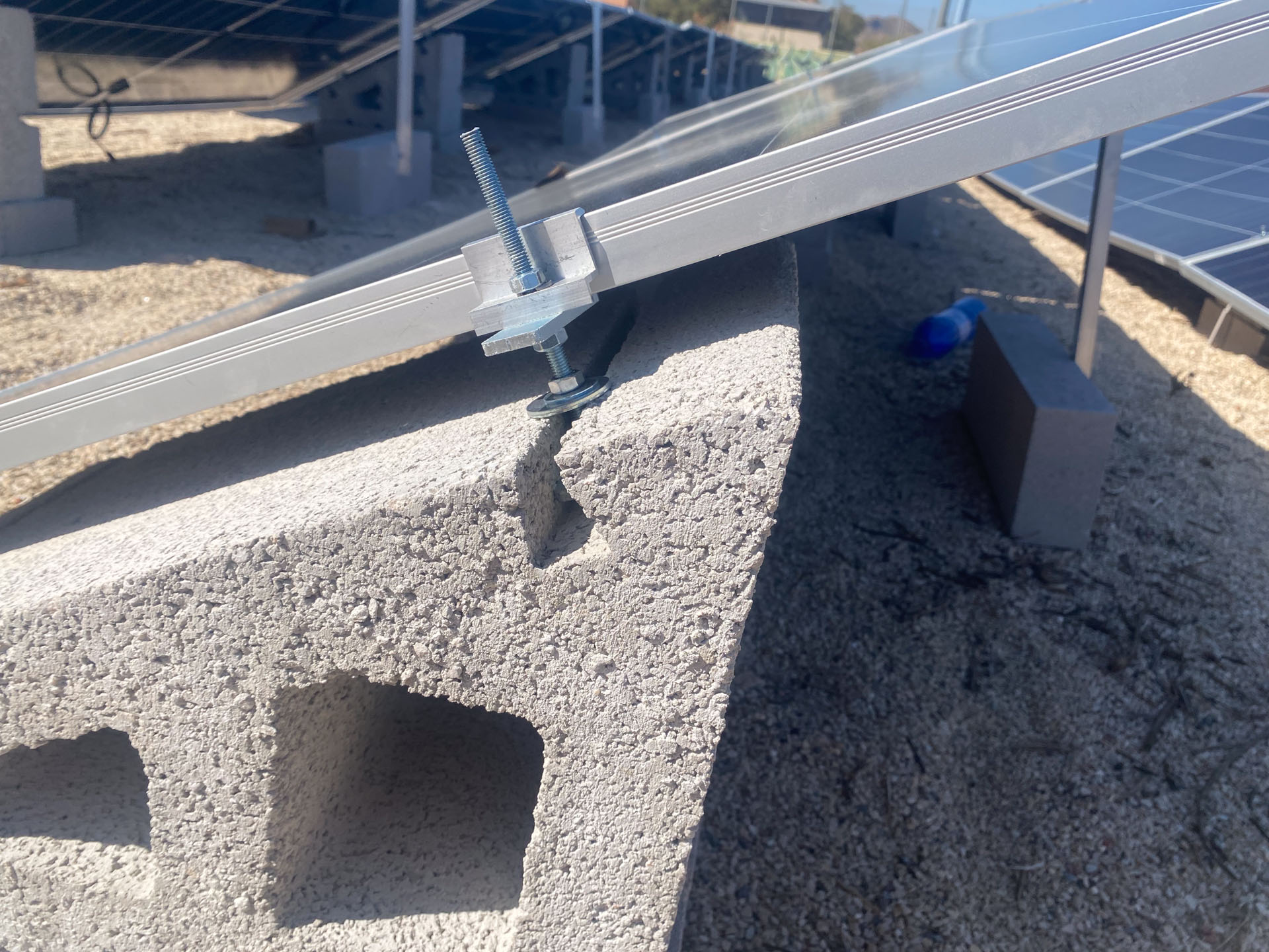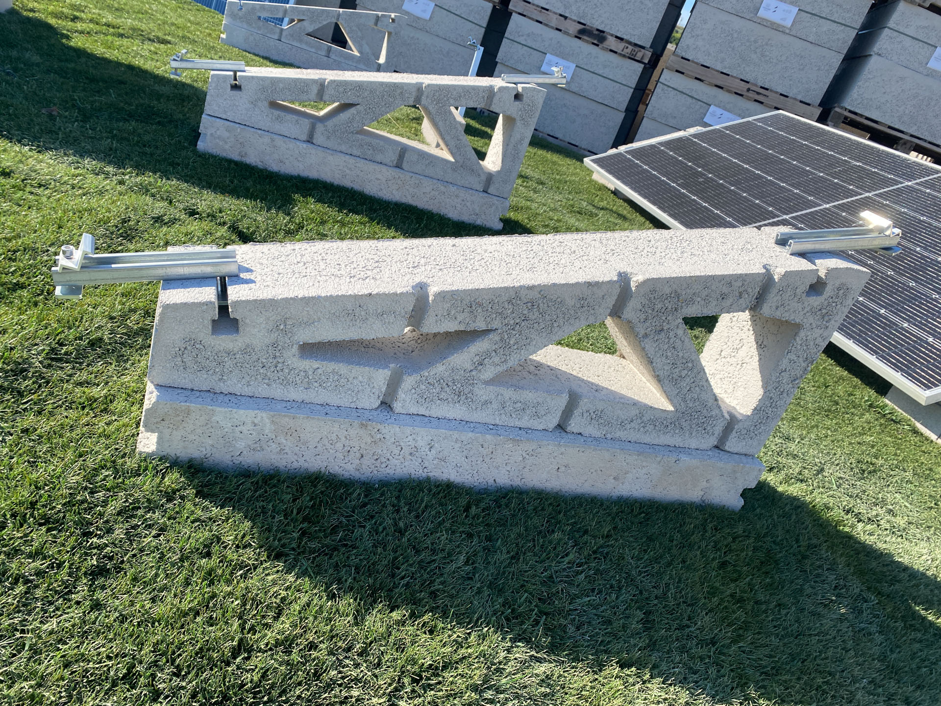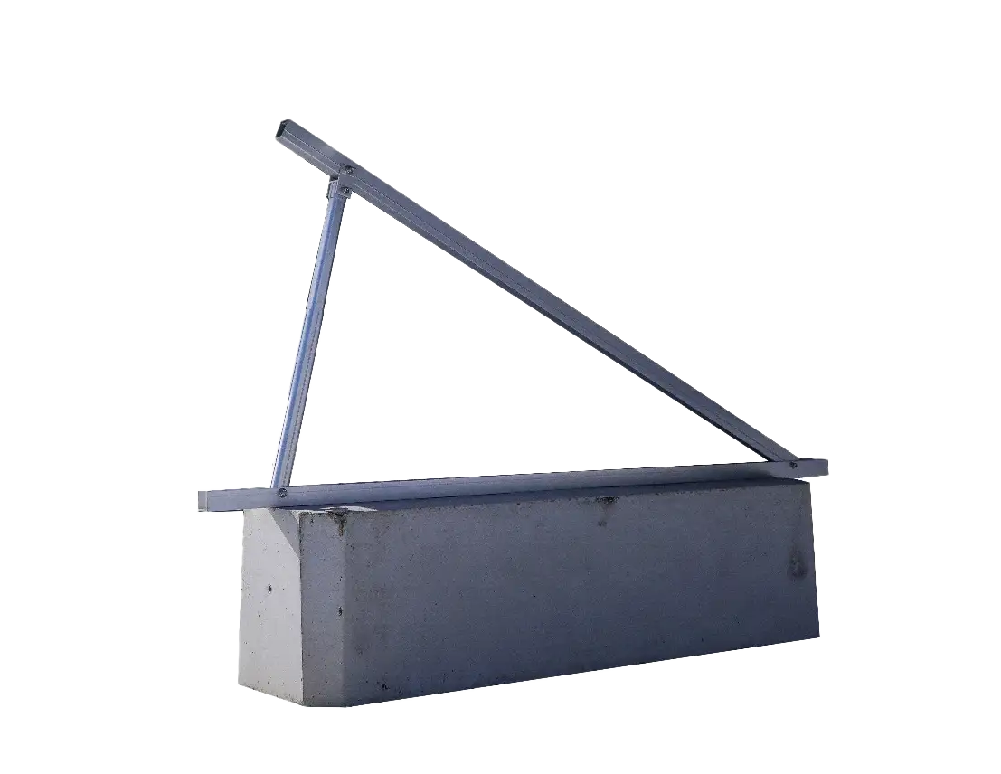 Este sistema combina una base de hormigón armado de 321 kg con una estructura metálica de aluminio y herrajes de acero inoxidable, ofreciendo una solución estable, duradera y ajustable para parques solares fotovoltaicos.